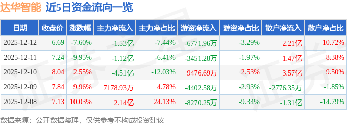证券之星消息,截至2025年12月12日收盘,达华智能(002512)报收于6.69元,下跌7.6%,换手率26.97%,成交量295.22万手,成交额20.61亿元。