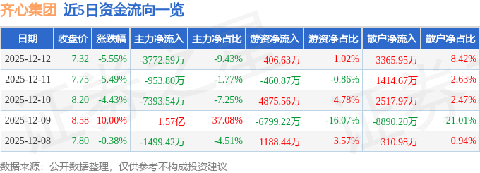 证券之星消息,截至2025年12月12日收盘,齐心集团(002301)报收于7.32元,下跌5.55%,换手率7.5%,成交量53.83万手,成交额4.0亿元。