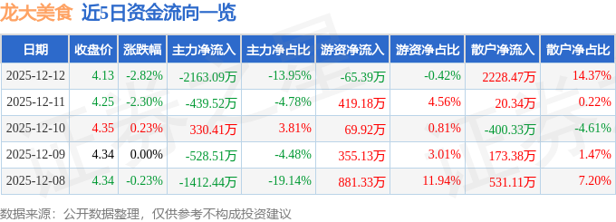 证券之星消息,截至2025年12月12日收盘,龙大美食(002726)报收于4.13元,下跌2.82%,换手率3.46%,成交量37.24万手,成交额1.55亿元。