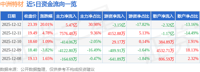 证券之星消息,截至2025年12月12日收盘,中洲特材(300963)报收于23.39元,上涨20.01%,涨停,换手率28.24%,成交量81.73万手,成交额17.65亿元。
