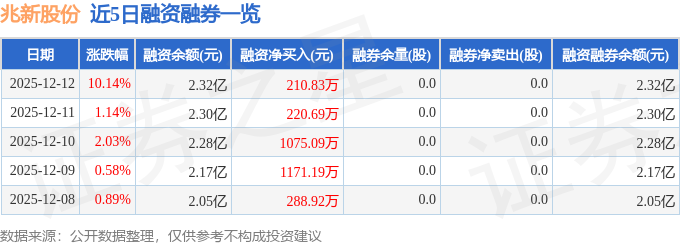 兆新股份融资融券信息显示,融资方面,当日融资买入3044.14万元,融资偿还2833.32万元,融资净买入210.83万元,连续3日净买入累计1506.61万元。融券方面,融券卖出0.0股,融券偿还0.0股,融券余量0.0股,融券余额0.0万元。融资融券余额2.32亿元。