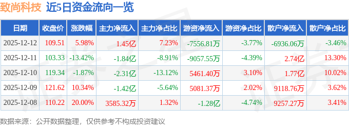 证券之星消息,截至2025年12月12日收盘,致尚科技(301486)报收于109.51元,上涨5.98%,换手率25.96%,成交量18.81万手,成交额20.06亿元。