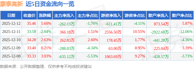证券之星消息,截至2025年12月12日收盘,蒙泰高新(300876)报收于35.46元,上涨5.6%,换手率5.29%,成交量4.29万手,成交额1.49亿元。