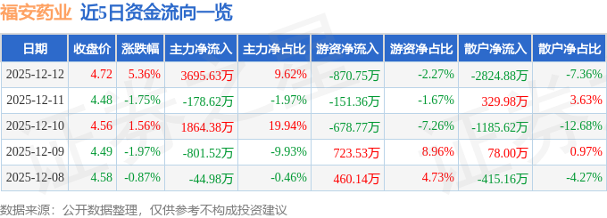 证券之星消息,截至2025年12月12日收盘,福安药业(300194)报收于4.72元,上涨5.36%,换手率8.47%,成交量82.04万手,成交额3.84亿元。