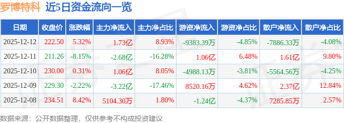 证券之星消息,截至2025年12月12日收盘,罗博特科(300757)报收于222.5元,上涨5.32%,换手率5.85%,成交量8.81万手,成交额19.35亿元。