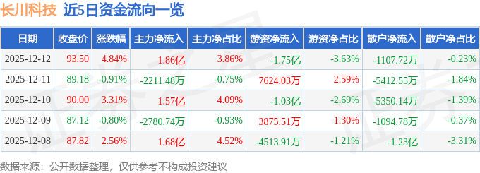 证券之星消息,截至2025年12月12日收盘,长川科技(300604)报收于93.5元,上涨4.84%,换手率10.67%,成交量52.23万手,成交额48.13亿元。