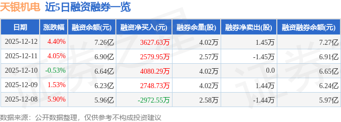 天银机电融资融券信息显示,融资方面,当日融资买入3.53亿元,融资偿还3.16亿元,融资净买入3627.63万元,连续3日净买入累计1.03亿元。融券方面,融券卖出1.45万股,融券偿还0.0股,融券余量4.02万股,融券余额98.17万元。融资融券余额7.27亿元。