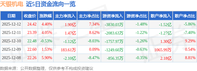 证券之星消息,截至2025年12月12日收盘,天银机电(300342)报收于24.42元,上涨4.4%,换手率25.17%,成交量105.41万手,成交额25.92亿元。
