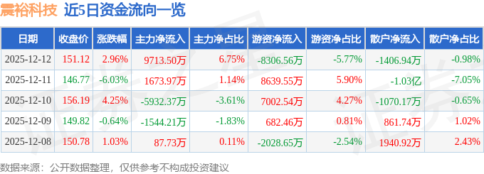 证券之星消息,截至2025年12月12日收盘,震裕科技(300953)报收于151.12元,上涨2.96%,换手率7.69%,成交量9.59万手,成交额14.39亿元。