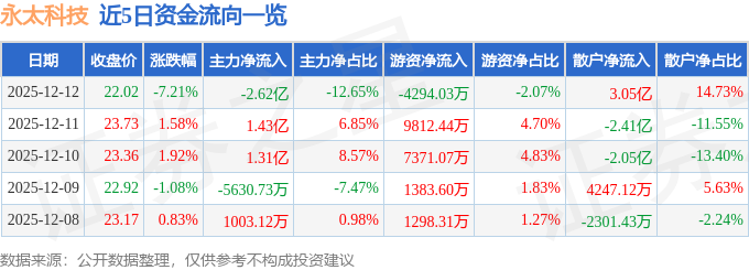 12月12日的资金流向数据方面,主力资金净流出2.62亿元,占总成交额12.65%,游资资金净流出4294.03万元,占总成交额2.07%,散户资金净流入3.05亿元,占总成交额14.73%。