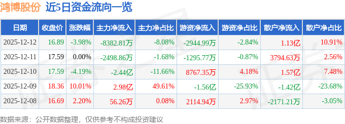证券之星消息,截至2025年12月12日收盘,鸿博股份(002229)报收于16.89元,下跌3.98%,换手率12.32%,成交量60.78万手,成交额10.38亿元。