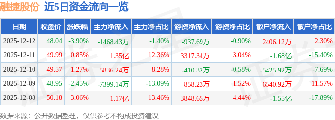 证券之星消息,截至2025年12月12日收盘,融捷股份(002192)报收于48.04元,下跌3.9%,换手率8.19%,成交量21.23万手,成交额10.47亿元。