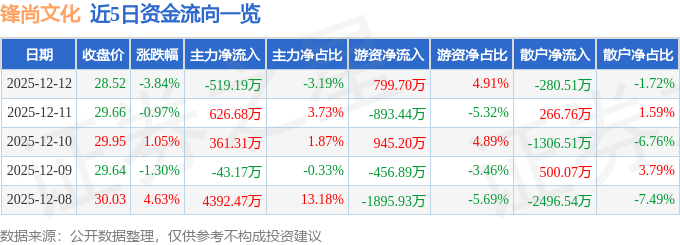 证券之星消息,截至2025年12月12日收盘,锋尚文化(300860)报收于28.52元,下跌3.84%,换手率5.18%,成交量5.67万手,成交额1.63亿元。