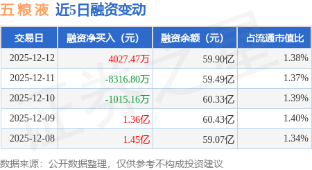 证券之星消息,12月12日,五 粮 液(000858)融资买入1.91亿元,融资偿还1.51亿元,融资净买入4027.47万元,融资余额59.9亿元,近20个交易日中有12个交易日出现融资净买入。