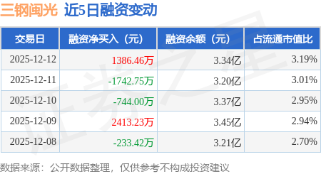 证券之星消息,12月12日,三钢闽光(002110)融资买入3449.75万元,融资偿还2063.29万元,融资净买入1386.46万元,融资余额3.34亿元。