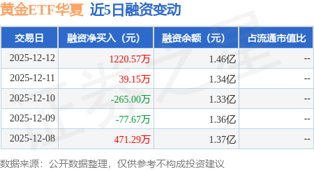证券之星消息,12月12日,黄金ETF华夏(518850)融资买入3948.53万元,融资偿还2727.96万元,融资净买入1220.57万元,融资余额1.46亿元,近20个交易日中有12个交易日出现融资净买入。