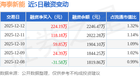 证券之星消息,12月12日,海泰新能(920985)融资买入315.13万元,融资偿还90.94万元,融资净买入224.19万元,融资余额2246.47万元,近3个交易日已连续净买入累计402.22万元,近20个交易日中有12个交易日出现融资净买入。