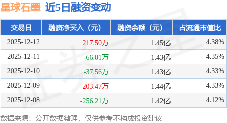 证券之星消息,12月12日,星球石墨(688633)融资买入290.34万元,融资偿还72.84万元,融资净买入217.5万元,融资余额1.45亿元,近20个交易日中有11个交易日出现融资净买入。