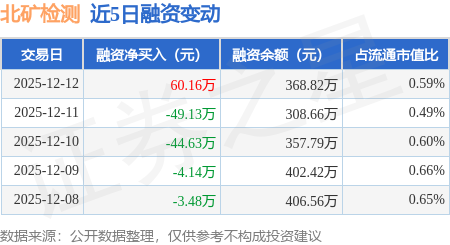 证券之星消息,12月12日,北矿检测(920160)融资买入198.84万元,融资偿还138.68万元,融资净买入60.16万元,融资余额368.82万元。