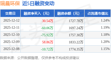 证券之星消息,12月12日,瑞晨环保(301273)融资买入186.21万元,融资偿还155.67万元,融资净买入30.54万元,融资余额1727.78万元,近20个交易日中有11个交易日出现融资净买入。