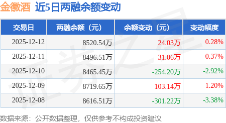 证券之星消息,12月12日,金徽酒(603919)融资买入356.88万元,融资偿还331.97万元,融资净买入24.91万元,融资余额8312.07万元。