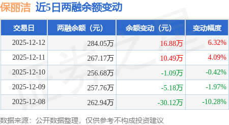 证券之星消息,12月12日,保丽洁(920802)融资买入36.52万元,融资偿还19.64万元,融资净买入16.88万元,融资余额284.05万元。
