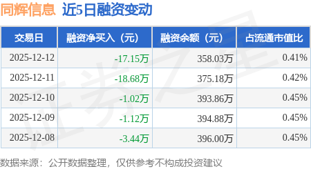 证券之星消息,12月12日,同辉信息(920090)融资买入2.42万元,融资偿还19.57万元,融资净卖出17.15万元,融资余额358.03万元。