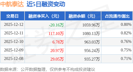 证券之星消息,12月12日,中航泰达(920263)融资买入111.87万元,融资偿还132.03万元,融资净卖出20.16万元,融资余额1059.96万元,近20个交易日中有14个交易日出现融资净买入。