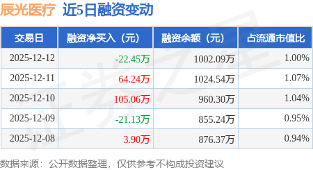 证券之星消息,12月12日,辰光医疗(920300)融资买入99.11万元,融资偿还121.56万元,融资净卖出22.45万元,融资余额1002.09万元。