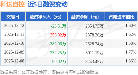 证券之星消息,12月12日,科达自控(920932)融资买入217.66万元,融资偿还241.17万元,融资净卖出23.51万元,融资余额2854.75万元。