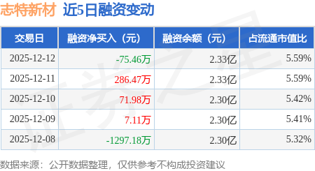 证券之星消息,12月12日,志特新材(300986)融资买入651.59万元,融资偿还727.06万元,融资净卖出75.46万元,融资余额2.33亿元。