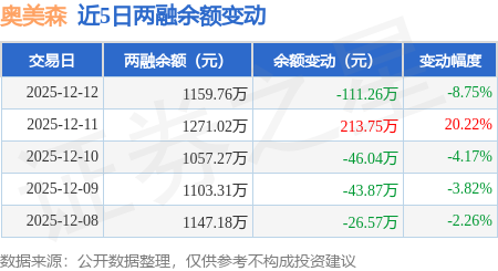 证券之星消息,12月12日,奥美森(920080)融资买入155.26万元,融资偿还266.52万元,融资净卖出111.26万元,融资余额1159.76万元。