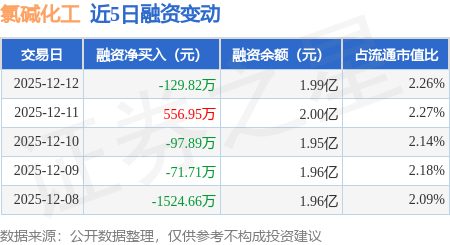 证券之星消息,12月12日,氯碱化工(600618)融资买入1075.92万元,融资偿还1205.74万元,融资净卖出129.82万元,融资余额1.99亿元。