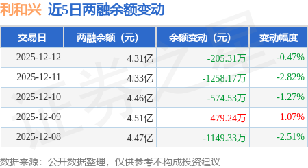 证券之星消息,12月12日,利和兴(301013)融资买入3642.85万元,融资偿还3848.16万元,融资净卖出205.31万元,融资余额4.31亿元。