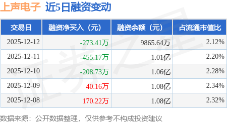 证券之星消息,12月12日,上声电子(688533)融资买入307.96万元,融资偿还581.37万元,融资净卖出273.41万元,融资余额9865.64万元,近20个交易日中有11个交易日出现融资净买入。