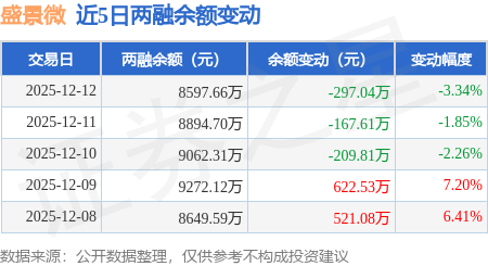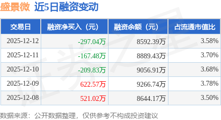 证券之星消息,12月12日,盛景微(603375)融资买入224.58万元,融资偿还521.62万元,融资净卖出297.04万元,融资余额8592.39万元。
