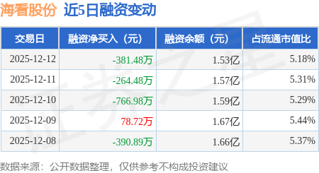 证券之星消息,12月12日,海看股份(301262)融资买入1387.66万元,融资偿还1769.14万元,融资净卖出381.48万元,融资余额1.53亿元。