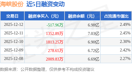 证券之星消息,12月12日,海峡股份(002320)融资买入5745.57万元,融资偿还6263.54万元,融资净卖出517.96万元,融资余额6.98亿元。