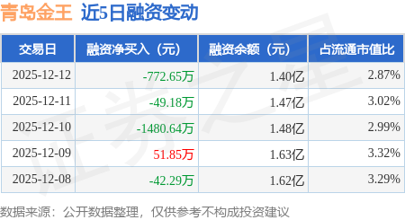 证券之星消息,12月12日,青岛金王(002094)融资买入204.95万元,融资偿还977.6万元,融资净卖出772.65万元,融资余额1.4亿元。