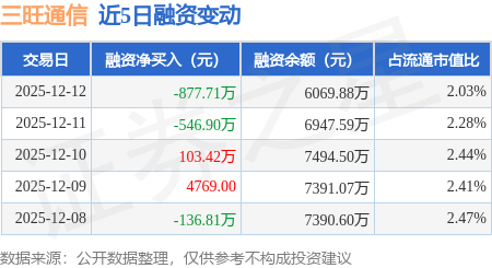 证券之星消息,12月12日,三旺通信(688618)融资买入441.76万元,融资偿还1319.47万元,融资净卖出877.71万元,融资余额6069.88万元。