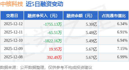 证券之星消息,12月12日,中核科技(000777)融资买入8151.26万元,融资偿还9906.39万元,融资净卖出1755.13万元,融资余额5.3亿元。