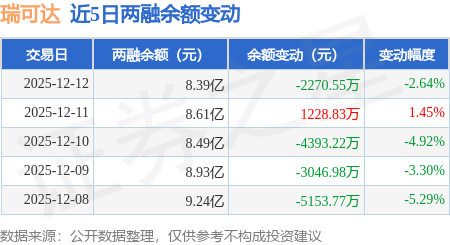 证券之星消息,12月12日,瑞可达(688800)融资买入1.22亿元,融资偿还1.45亿元,融资净卖出2271.32万元,融资余额8.38亿元。