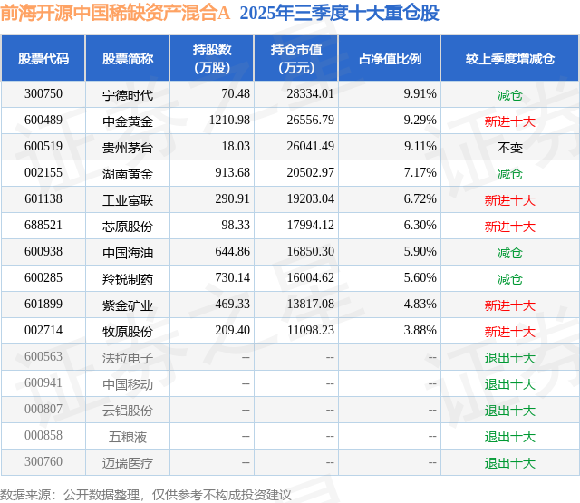 前海开源中国稀缺资产混合A的前十大重仓股如下: