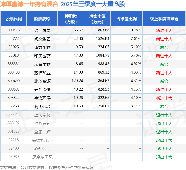 淳厚鑫淳一年持有混合的前十大重仓股如下: