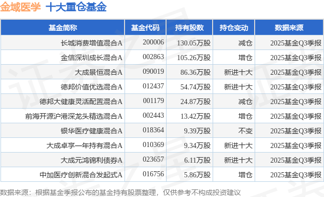 根据2025基金Q3季报公募基金重仓股数据,重仓该股的公募基金共11家,其中持有数量最多的公募基金为长城基金的长城消费增值混合A。长城消费增值混合A目前规模为5.16亿元,最新净值1.0726(12月12日),较上一交易日上涨0.83%,近一年上涨4.87%。该公募基金现任基金经理为龙宇飞。