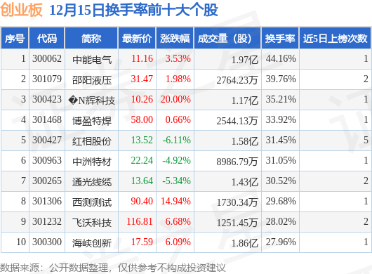 当日创业板换手率前10大个股中7只个股收涨,平均涨幅7.7%,其中中能电气(300062)以换手率44.16%排第一,4只个股近5个交易日中多次上榜。