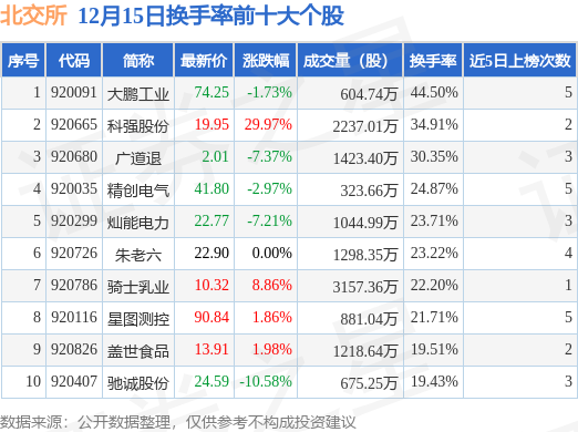 当日北交所换手率前10大个股中4只个股收涨,平均涨幅10.67%,其中大鹏工业(920091)以换手率44.5%排第一,9只个股近5个交易日中多次上榜。