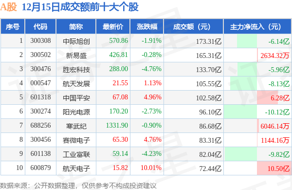 当日A股成交额前10大个股中4只个股收涨,平均涨幅5.21%,其中中际旭创(300308)以成交额173.31亿元排第一。从主力资金流入看,成交额前10大个股中有5只个股呈现主力资金净流入。