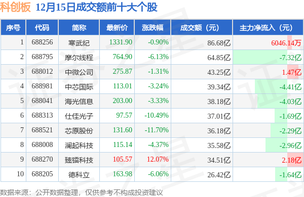 当日科创板成交额前10大个股中1只个股收涨,平均涨幅12.07%,其中寒武纪(688256)以成交额86.68亿元排第一。从主力资金流入看,成交额前10大个股中有3只个股呈现主力资金净流入。