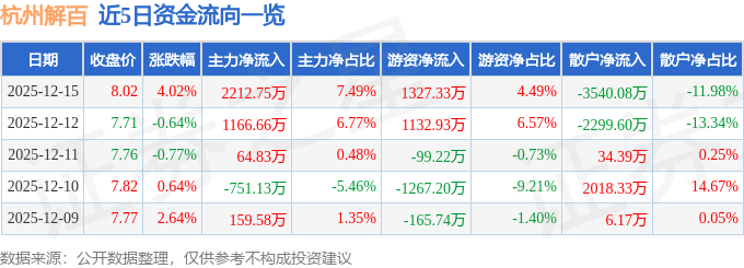 证券之星消息,截至2025年12月15日收盘,杭州解百(600814)报收于8.02元,上涨4.02%,换手率5.02%,成交量36.89万手,成交额2.95亿元。